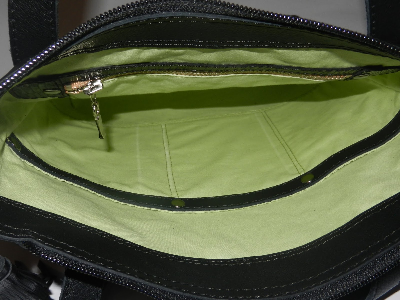 Сумочка комбинированная из итальянской черной кожи и с тиснением под крокодила. Внизу выточки, которые создают объем. Сзади карман на молни.